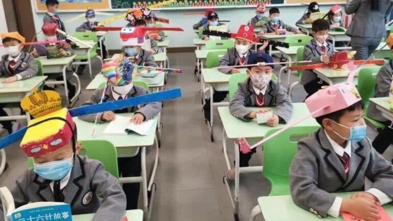 In the midst of this situation, Hangzhou schoolchildren were seen wearing special hats to practice social distancing in the classroom.