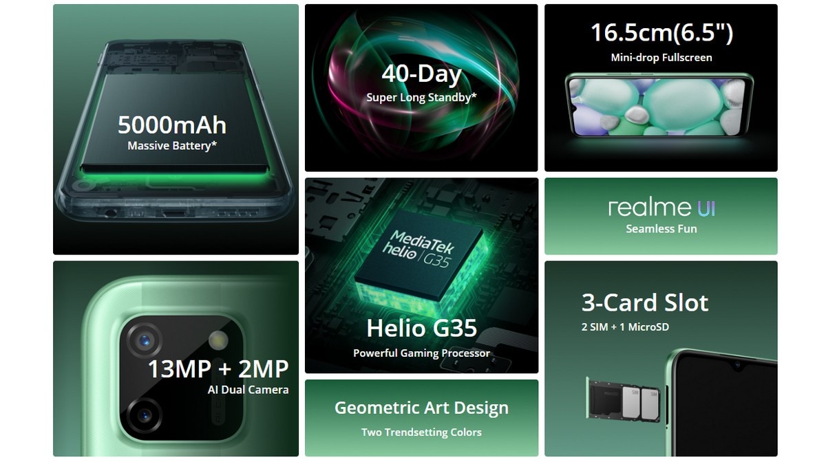 The Realme C11 dual-SIM (Nano) runs on Android 10, with Realme UI at the end. It has a 6.5-inch HD+ (720x1,600 pixels) mini-drop display with an aspect ratio of 20:9 and a screen-to - body ratio of 88.7 per cent. The phone comes under the hood with an octa-core MediaTek Helio G35 SoC coupled with 2 GB LPDDR4X RAM.